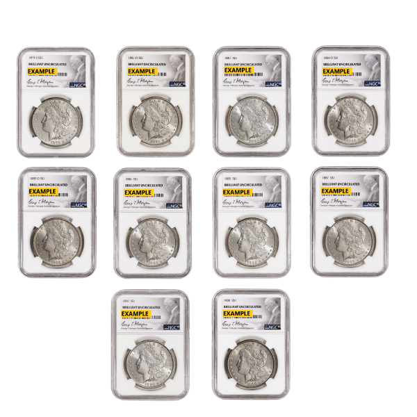 Morgan silver dollars are among the most popular and collectible silver coins ever struck. Each set contains 10 Morgan silver dollars that are certified and graded by the Numismatic Guarantee Corporation (NGC). These coins all come with a special edition G.T. Morgan certification label.