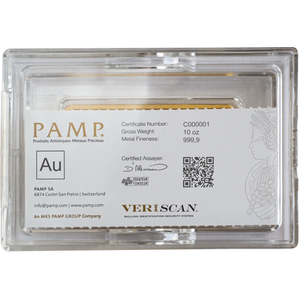 - Each bar is individually controlled, registered, and secured within CertiPAMP™ protective packaging, which includes an integrated and official assay certificate guaranteeing the fine precious metal content.