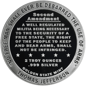 The Second Amendment, enshrined in the American Constitution, underscores citizens’ fundamental right to bear arms. This 2 oz silver round pays homage to this pivotal constitutional provision, serving as a poignant reminder of the sacrifices and pivotal moments that shaped the nation. The immortal words of Thomas Jefferson, “NO MAN SHALL EVER BE DEBARRED THE USE OF ARMS,” echo through time, lending profound significance to this emblematic piece cherished by the politically aware and history enthusiasts alike.