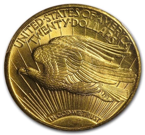 Several changes were made to the $20 Saint-Gaudens Double Eagle design during the years the series was in production. The coins issued from 1907-1908 do not include the motto “In God We Trust,” which wasn’t added until later. In 1912, the number of stars surrounding Lady Liberty on the obverse changed from 46 to 48 when New Mexico and Arizona became states.