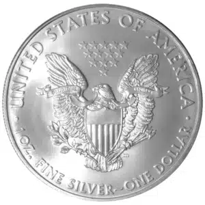 The reverse showcases an eagle in flight, shield over its chest, surrounded by 13 stars. ‘UNITED STATES of AMERICA’ is etched above, while ‘ONE DOLLAR’ denotes its face value. ‘1 OZ FINE SILVER’ is at the coin’s base, accompanied by ‘E PLURIBUS UNUM’ in smaller text, signifying unity from diversity.