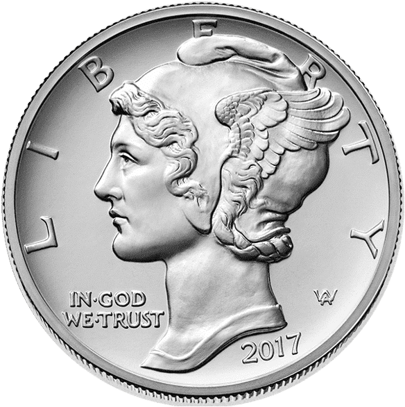The obverse design features a high-relief likeness of “Winged Liberty” from the “Mercury Dime” obverse by famed American coin designer and medallic artist Adolph A. Weinman.
