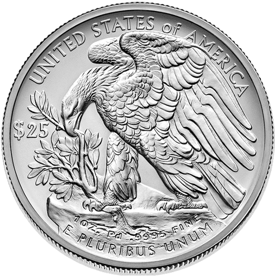 All American Eagles are legal tender coins, with their face value imprinted in U.S. dollars. Although their face value is largely symbolic, it provides proof of their authenticity as official U.S. coinage. The one-ounce palladium coin carries a face value of $25.