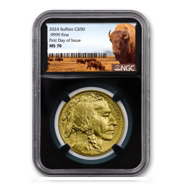 - First Day of Issue, indicating these coins were dispatched from the U.S. Mint on the inaugural day of the 2024 Gold Buffalo release.