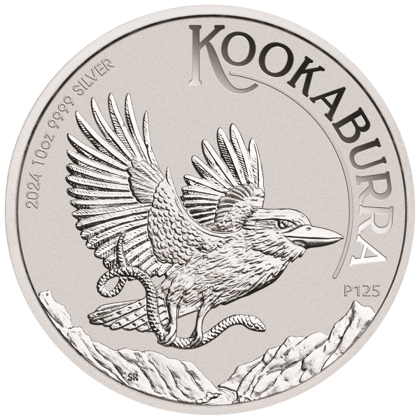 The Perth Mint launched the Australian Kookaburra Silver Coin series in 1990, captivating collectors and investors with its blend of Australian heritage and natural beauty. Each coin features a vigilant kookaburra in flight, clutching a snake in its talons, soaring over a gorge. Alongside the depiction of the kookaburra, you’ll find details such as the coin’s weight, purity, the year 2024, and a distinctive ‘P125’ mintmark commemorating The Perth Mint’s 125th anniversary.