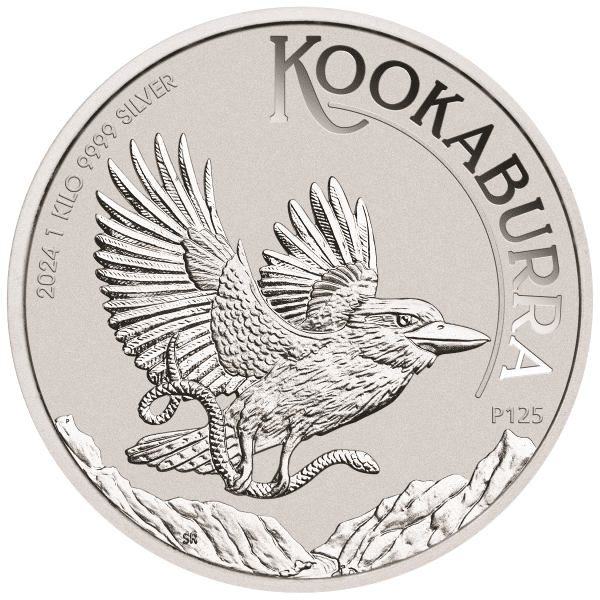 On the reverse side of the 2024 1 Kilo Silver Kookaburra Coins, a kookaburra is depicted in flight, clutching a small serpent as it soars over a gorge. This design includes both the micro-laser engraved security letter and the P125 mint mark.