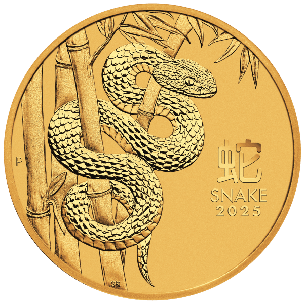 Reverse: Showcases an intricate design of a snake coiled among bamboo stems. Also included are the Chinese character for “snake,” the inscription “SNAKE 2025,” and The Perth Mint’s “P” mint mark