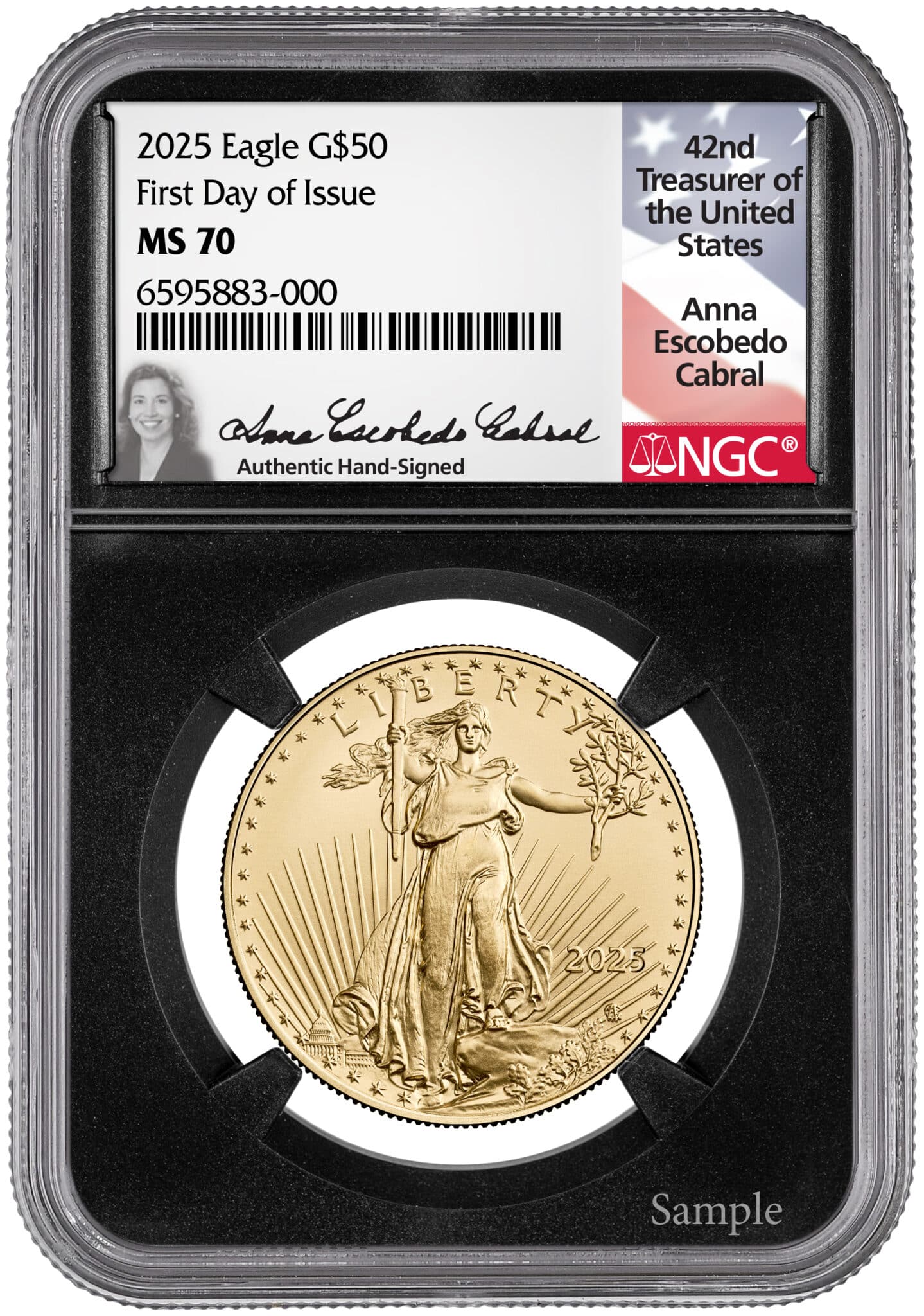 Product Description: Anna Cabral $50 Gold American Eagle – First Day of Issue Limited Edition