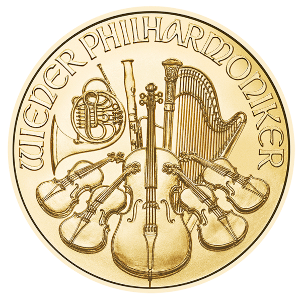 On the reverse, an array of finely crafted musical instruments, including a cello and four violins, symbolizes the orchestral essence of the Wiener Philharmoniker. The inscription “Wiener Philharmoniker” above the instruments further solidifies the coin’s dedication to celebrating Austria’s musical excellence.