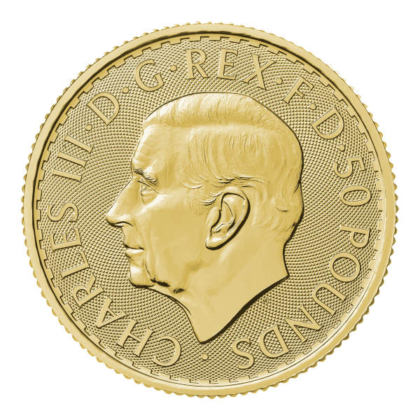 On the obverse of the 2025 1/2 oz Gold Britannia Coins, a regal portrayal of King Charles III takes center stage. Designed by Martin Jennings in late 2022, this portrait of His Majesty adheres to British tradition by omitting the royal crown, signifying a unique transition from the previous monarch’s reign.