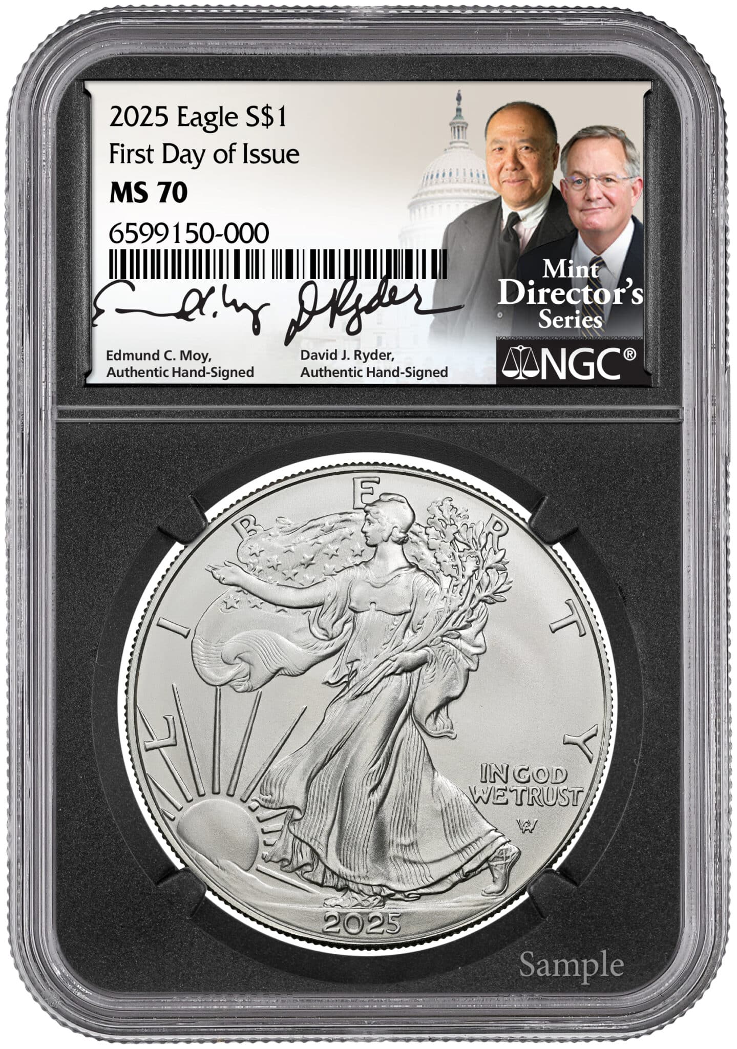What sets this collectible apart is the dual signature label signed by two of the most respected figures in U.S. Mint history: Edmund C. Moy, the 38th U.S. Mint Director, and John M. Ryder, former U.S. Mint Chief Engraver. Their combined signatures on the NGC certification label add rarity, prestige, and long-term collectible value.