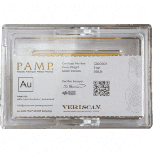 The 5 oz gold bar is one of the most sought-after sizes produced by PAMP, a leader in gold bullion products. PAMP gold bars are recognized as Good Delivery by the Swiss National Bank, the London Bullion Market Association, the Chicago Metals Exchange, and many other international markets. These bars benefit from PAMP’s involvement with the Public-Private Alliance for Responsible Minerals Trade, ensuring responsible sourcing of precious metals. Additionally, PAMP gold bars are assayed by federal assayers in compliance with the Swiss Precious Metals Control law, guaranteeing their quality.
