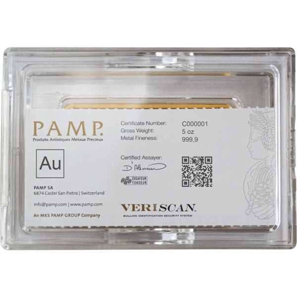 - Each bar is individually controlled, registered, and secured within CertiPAMP™ protective packaging, which includes an integrated and official assay certificate guaranteeing the fine precious metal content.