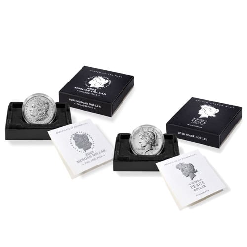 Invest in the legacy of American coinage with the 2023(P) 2-Coin Morgan and Peace Silver Dollar Set, a tribute to the nation’s rich numismatic heritage.